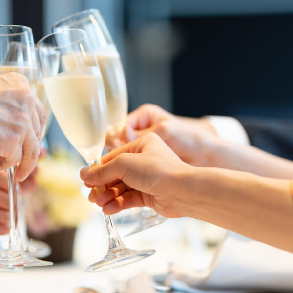 格式がありながらも、大きな窓から柔らかな自然光が降り注ぎ、あたたかみの感じられる空間。白とブラウンが基調の上品で落ち着いたしつらえは、優雅な美しさを持ちながらも主張し過ぎず、パーティを引き立てます。