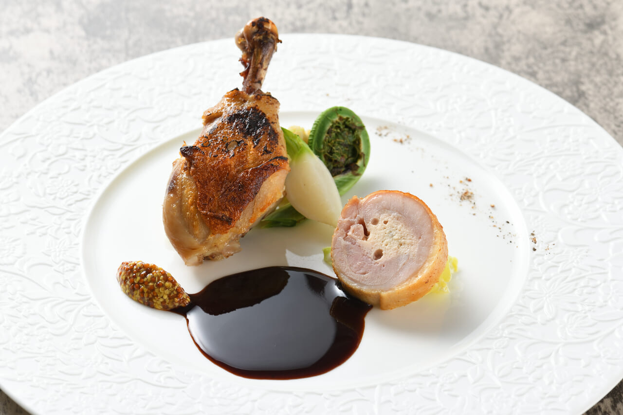 スモーク香る鶏もも肉のコンフィとバロティーヌ マデラ酒のソース