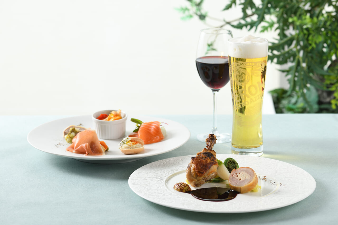 武道館やお堀を臨む開放的な屋上庭園に隣接するカフェで、シェフおすすめの前菜5種盛り&肉料理の2皿と30種以上の2時間フリードリンクをご堪能ください。