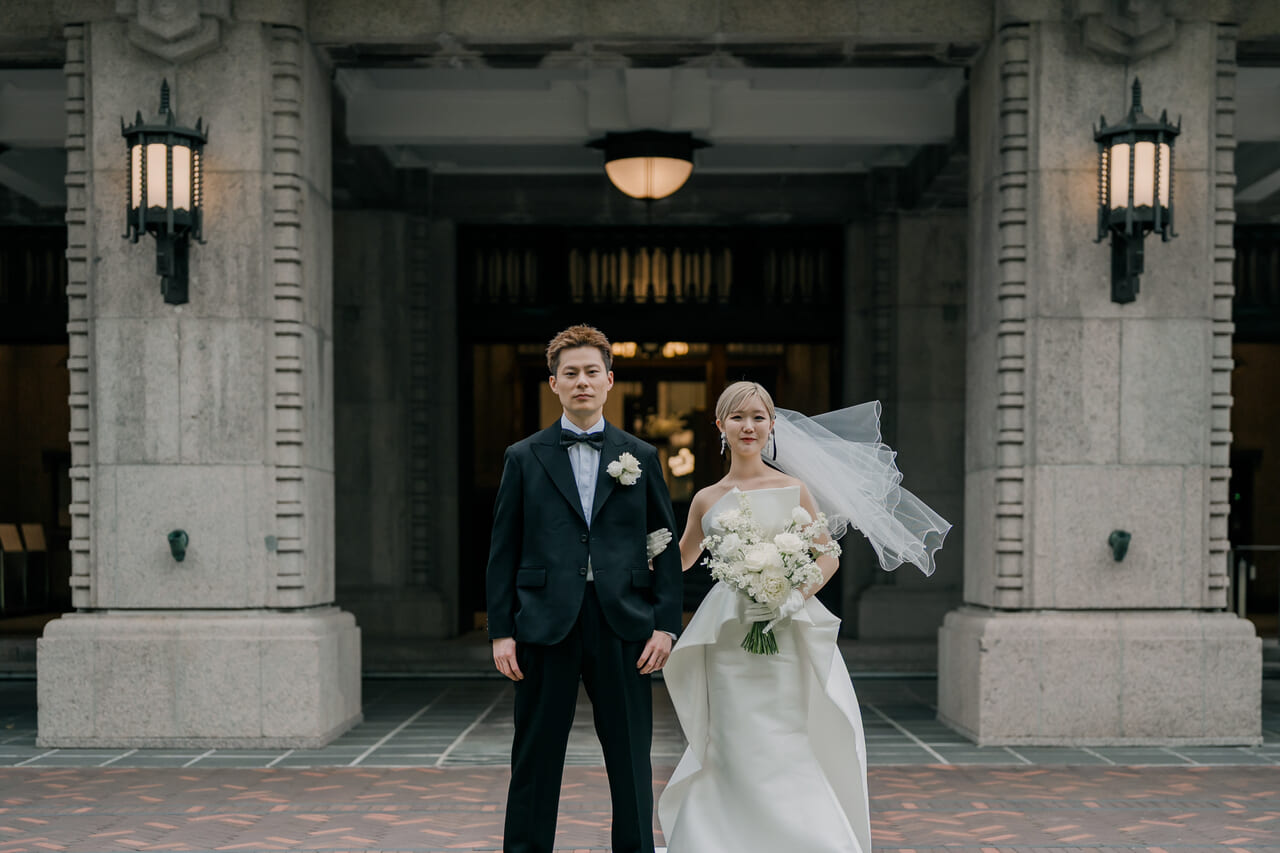 おふたりが運命の舞台として選ばれたのは、国の重要文化財でもある九段会館テラス。型にはまった結婚式ではなく、歴史と品格が薫るこの場所だからこそ叶えられる、唯一無二の祝宴に魅力を感じられました。伝統的な建築美と、現代的な感性が融合した空間は、おふたりの世界観を表現するのに、まさに理想の舞台。そして、ゲストへのおもてなしの心を形にする、美味しいお料理も、この場所を選ぶ大きな決め手となりました。