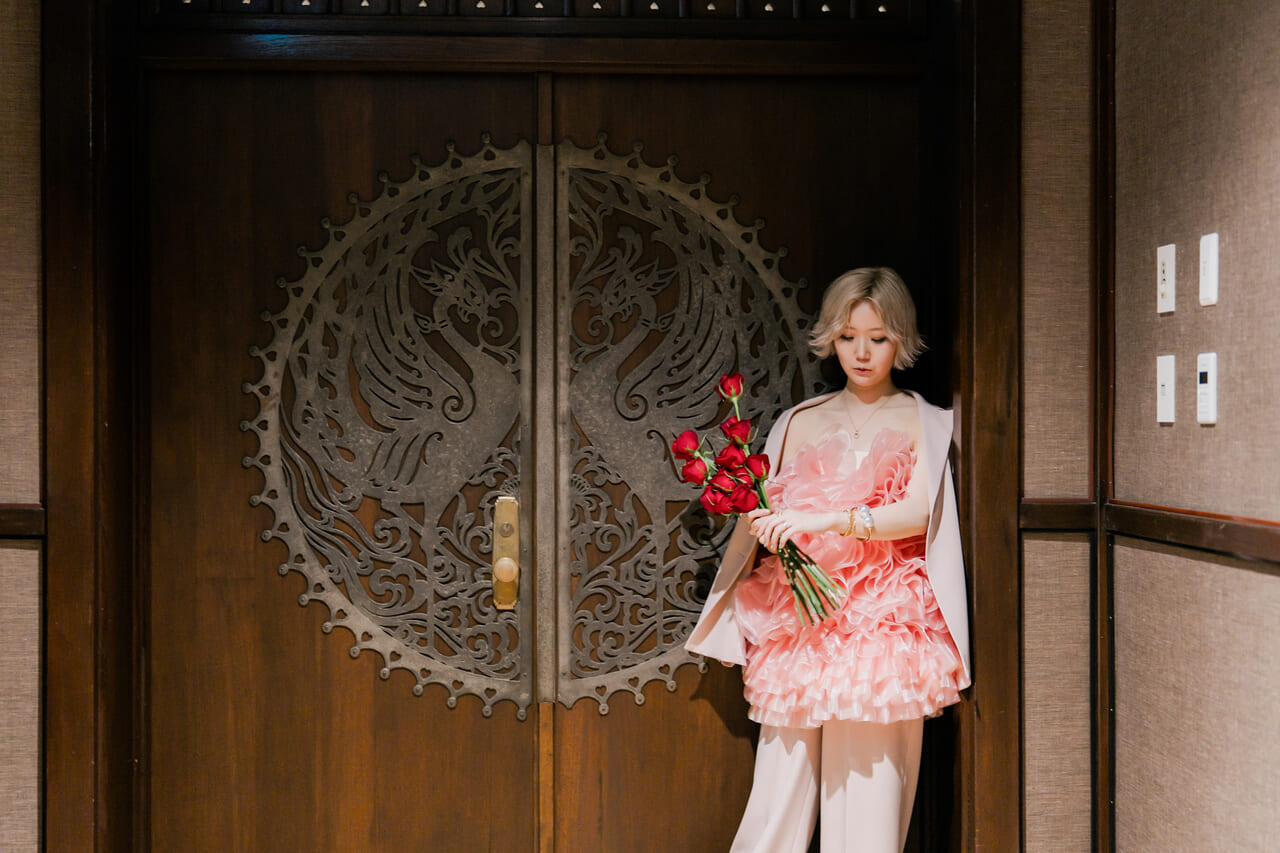 ウエディングドレスの際には、黒いリボンを使ったヘアアレンジでアクセントを。そして、お色直しでは、ピンクのドレスにパンツを組み合わせた、センス溢れる新婦様のお姿にゲストから歓声が上がる時間に。新郎様のブートニアも、お色直しに合わせて白から赤へと変化し、細部にまでこだわりが光ります。おふたりならではの個性を表現した空間に、ゲストからカメラのシャッターが鳴りやまない時間となりました。